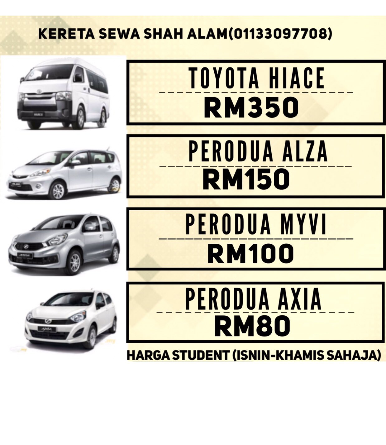 Kereta Sewa Shahalam On Twitter Kereta Sewa Shah Alam Seksyen 7 Hiace Alza Myvi Axia Sahaja Harga Student Untuk Isnin Khamis Sahaja Tidak Termasok Cuti Umum Https T Co Qqrrggu5fy Https T Co Qqrrggu5fy Https T Co Qqrrggu5fy